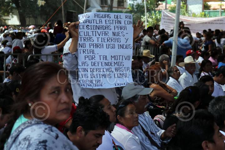 CUAUTLA, MORELOS, 10FEBRERO2019.- Opositores a la Central de Ciclo Combinado de Huexca manifiestan su rechazo a esta termoeléctrica durante la participación del presidente Andrés Manuel López Obrador. El presidente de la República visitó esta ciudad para presentar la “Propuesta del gobierno federal Planta Termoeléctrica en Huexca”, que consiste en una consulta pública en los estados de Morelos, Tlaxcala y Puebla los días 23 y 24 de febrero, y la obtención de un estudio de un organismo internacional para determinar el futuro de esta planta que ha generado rechazo de una parte de la población a la que el mandatario llamó “radicales de izquierda, conservadores”. FOTO: MARGARITO PÉREZ RETANA /CUARTOSCURO.COM