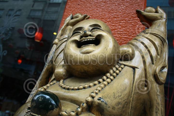 MEXICO, D.F., 22AGOSTO08.- Estatuilla de Buda colocada como bienvenida en la mayoría de los restaurates del Barrio Chino ubicado en la calle de Dolores del Centro Histórico, esta figura también es utilizada como amuleto de la buena suerte y abundancia. FOTO: COSME RADA/ CUARTOSCURO.COM