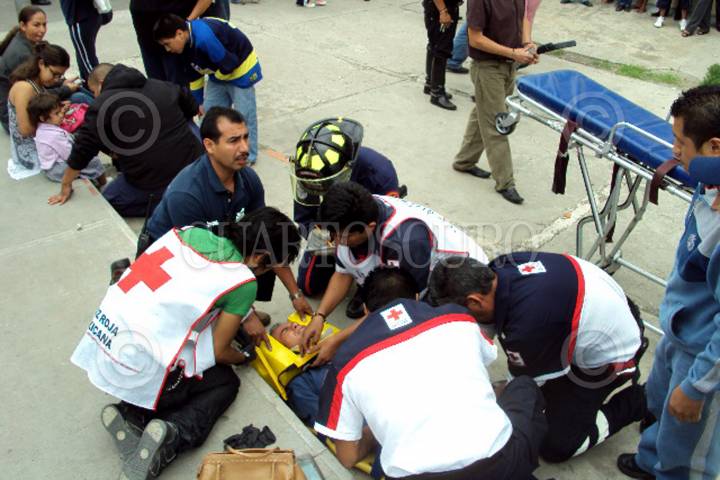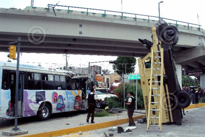 CUAUTITLAN IZCALLI, ESTADO DE MÉXICO, 04SEPTIEMBRE2010.- Una camioneta de Valores de la empresa COMETRA con numero económico 2157, sale del camino cayendo15 metros, desde un puente vehicular ubicado en Teotihuacan y 1o de Mayo en la colonia Centro de Cuautitlan Izcalli, sobre un autobús de pasajeros de la Ruta 27 Nuevo Milenio con numero económico 193, que corre de Chapultepec a Cuautitlan Izcalli. Dejando como resultado 7 personas lesionadas graves, mismos que fueron atendidos por paramédicos y trasladados al hospital regional de la Cruz Roja Mexicana de Cuautitlan Izcalli. FOTO: LUIS CARBAYO/CUARTOSCURO.COM