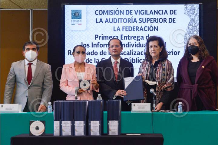 Los diputados: Marco Antonio Andrade Zavala; Ruth Salinas Reyes; Marcela Guillermina Velasco; María Martha García Flores, y Manuel Andrade Martínez, director jurídico de la Auditoría Superior, realizaron la primer entrega de los informes individuales del resultado de la fiscalización superior de la cuenta pública 2020, durante la reunión de la Comisión de Vigilancia de la Auditoría Superior de la Federación de la Cámara de Diputados.