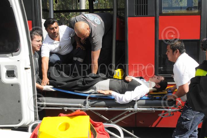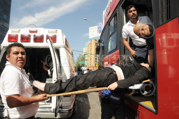 MÉXICO, D.F., 22FEBRERO2010.- Cinco personas, resultaron con diversas lesiones al impactarse el Metrobus en el que viajaban, contra un auto Focus con placas 488-VHY sobre la avenida Insurgentes al cruce con Paseo de la Reforma en la colonia Juárez, por lo que arribaron varias unidades de emergencia para la atención de los heridos. FOTO: LUIS CARBAYO/CUARTOSCURO.COM