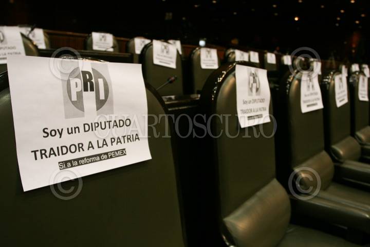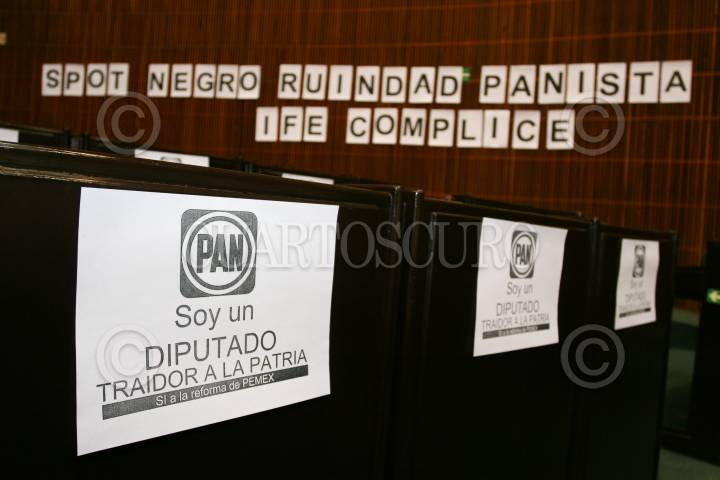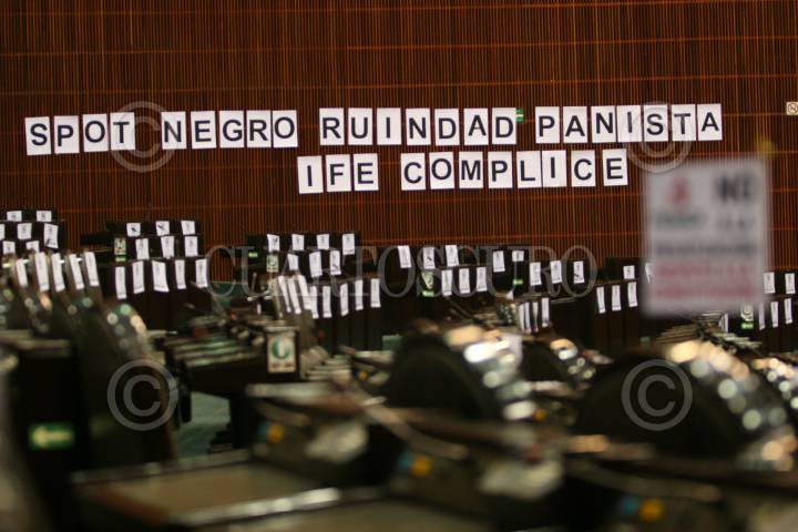 MÉXICO D.F. 21ABRIL2008.-Por la maña el salón de plenos de la Cámara de Diputados amanecio con letreros con la leyenda de "Soy un Diputado Traidor de la Patria" letreros que después fueron retirados por diputados del pertenecientes al FAP. FOTO: GUILLERMO PEREA /CUARTOSCURO.COM