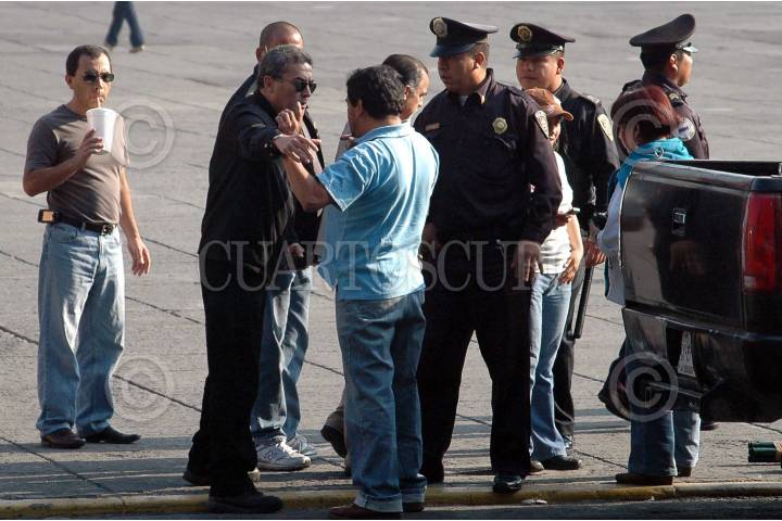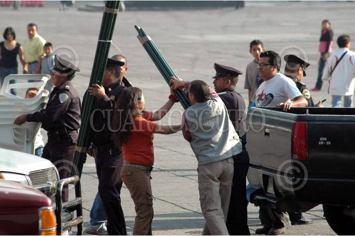 MÉXICO, D.F., 10ABRIL2010.- Miembros de La Otra Campaña pertenecientes a el Ejercito Zapatista de Liberación Nacional fueron retirados de forma violenta por parte de elementos de seguridad pública local cuando estos colocaban un campamento en la plancha del Zócalo para participar en los actos políticos-culturales de la conmemoración del 91 Aniversario Luctuosos de Emiliano Zapata, los policías les argumentaron que estaban transgrediendo el orden público y les incautaron sus cosas. FOTO: IVÁN MENDEZ/CUARTOSCURO.COM
