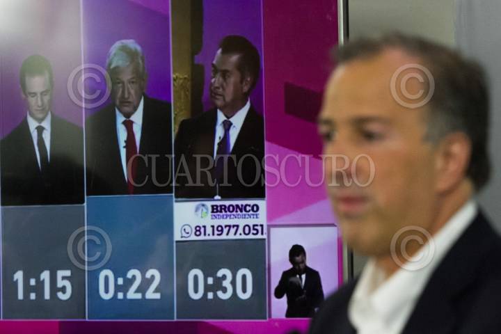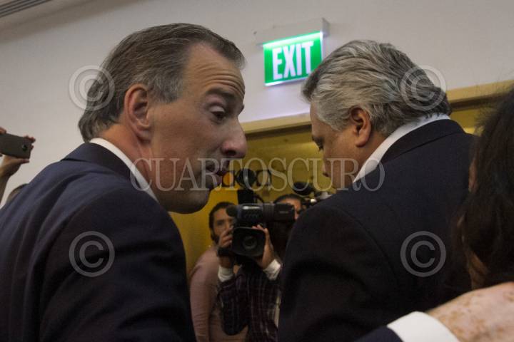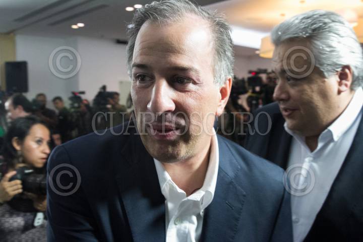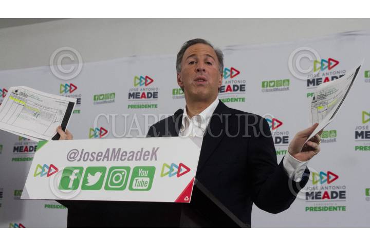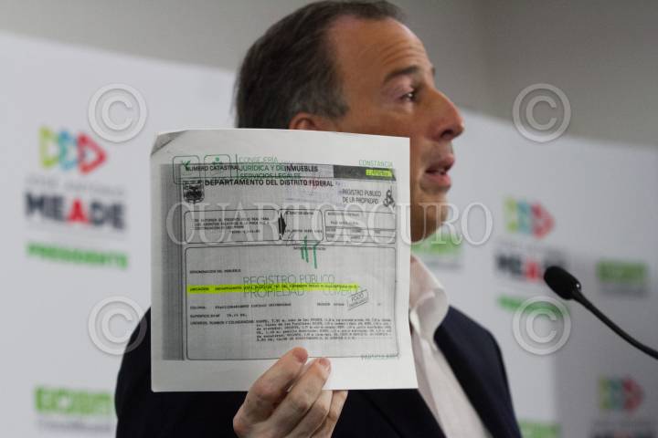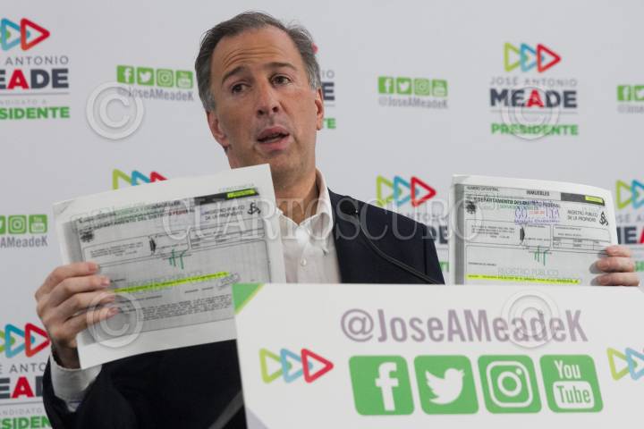 CIUDAD DE MÉXICO, 23ABRIL2018.- José Antonio Meade Kuribreña, candidato presidencial de la coalición "Todos por México", presentó dos documentos del Registro Público de la Propiedad con los que supuestamente le acredita dos departamentos a nombre del candidato presidencial Andrés Manuel López Obrador. Meade señalo que ayer en el debate reto al tabasqueño, que si lograba demostrar que había mentido en su declaración patrimonial al no dar a conocer estas propiedades, el de Morena tendría que regalárselos. El abanderado priista dijo que espera las respuesta y que las propiedades serán donadas a dos familias afectadas por el sismo del 19 de septiembre del año pasado. FOTO: MOISÉS PABLO /CUARTOSCURO.COM