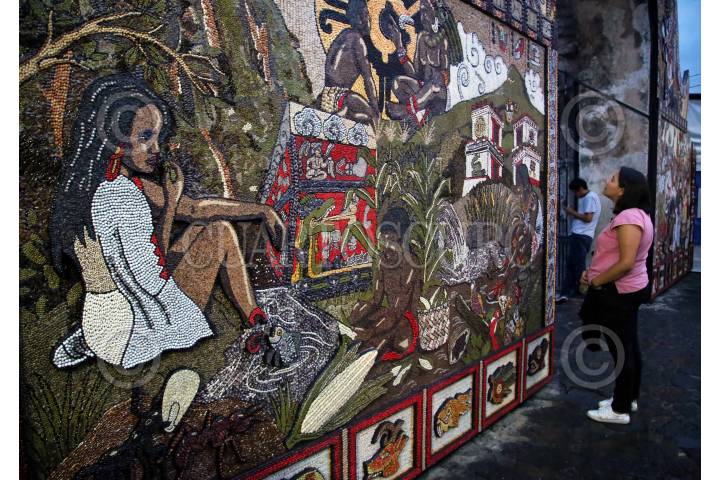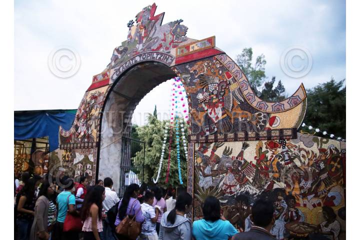 TEPOZTLÁN, MORELOS, 08SEPTIEMBRE2019.- Arco de semillas colocado en la entrada del templo de este pueblo, que celebra a Nuestra Señora de Natividad este día. FOTO: MARGARITO PÉREZ RETANA /CUARTOSCURO.COM