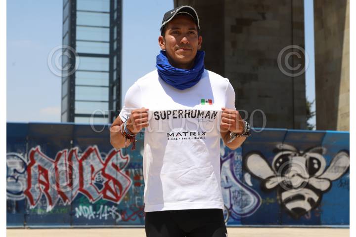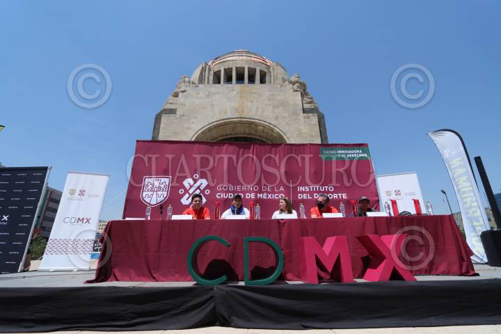 Conferencia de prensa con el ultramaratonista Daniel Almanza, quien realiza el reto del “Superhuman” que implica correr 6 mil kilómetros en 100 días, en el Monumento a la Revolución.