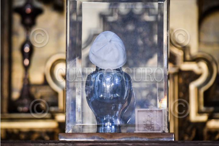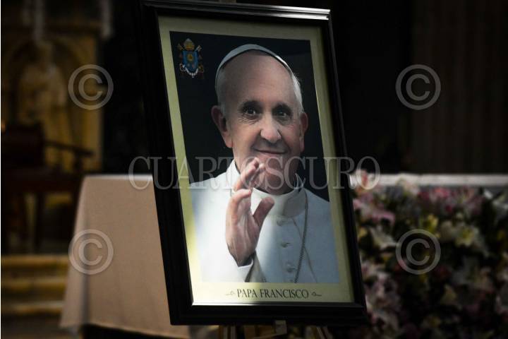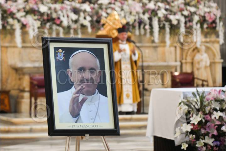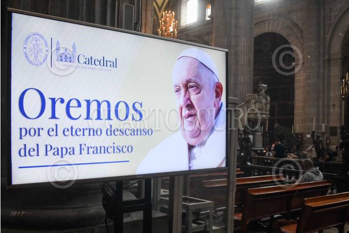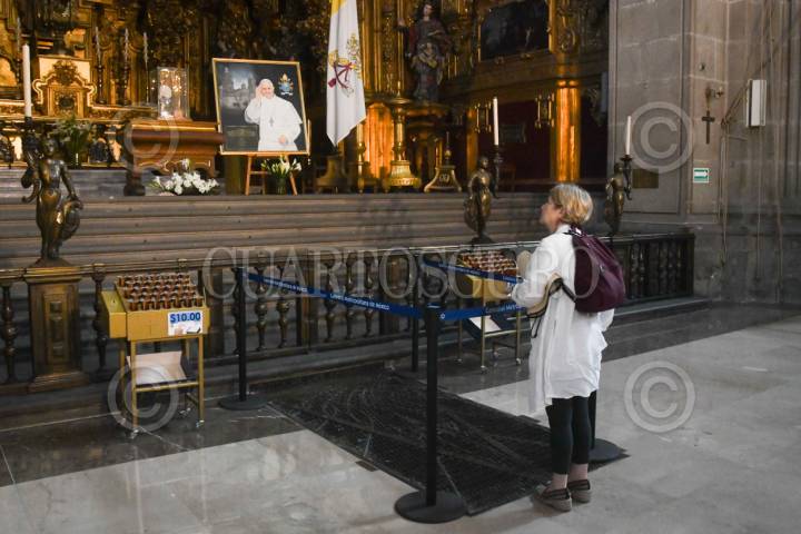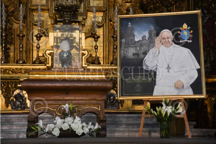 CIUDAD DE MÉXICO, 22ABRIL2025.- Retratos y un solideo del Papa Francisco permanecen en la Catedral Metropolitana para rendirle homenaje a un día de su fallecimiento. FOTO: MARIO JASSO/CUARTOSCURO.COM