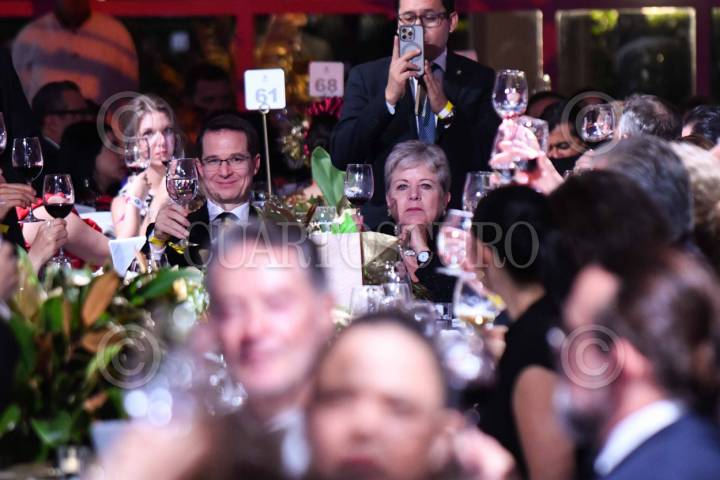 CIUDAD DE MÉXICO, 12JULIO2025.- Ricardo Anaya, senador del PAN, y Alicia Bárcena, secretaría de Medio Ambiente y Recursos Naturales, realizan un brindis al terminar la reunión y cena de gala con motivo de la bienvenida a Ronald Johnson, embajador de Estados Unidos en México. FOTO: MARIO JASSO/CUARTOSCURO.COM