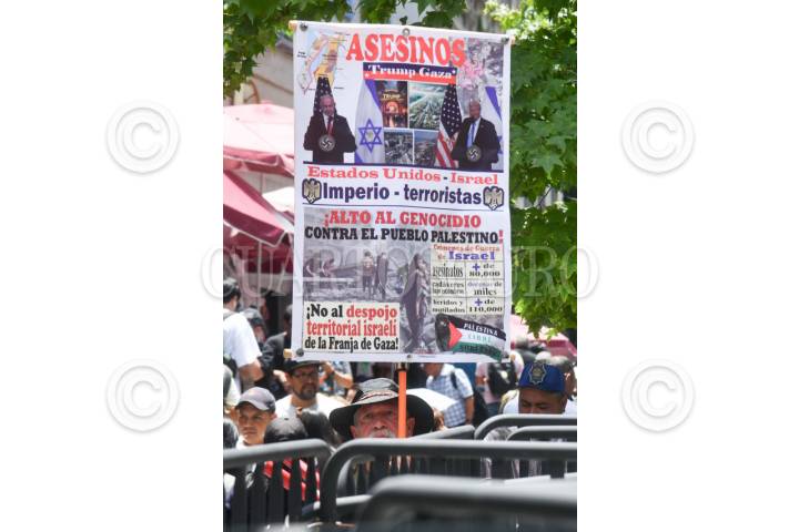 CIUDAD DE MÉXICO, 30JULIO2025.- Un hombre muestra una cartulina en contra del gobierno de Israel y Estados Unidos, sobre la calle de Correo Mayor a un costado de Palacio Nacional, en donde Claudia Sheinbaum, presidenta de México, sostendrá una reunión privada con legisladores de los Estados Unidos. FOTO: MARIO JASSO/CUARTOSCURO.COM