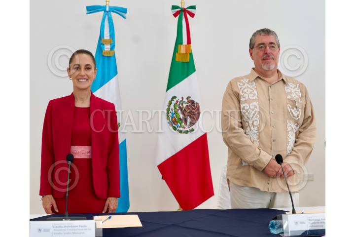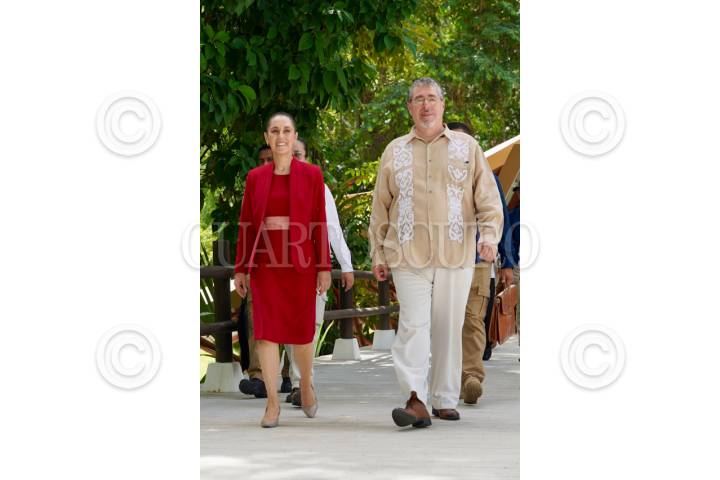 PETÉN, GUATEMALA, 15AGOSTO2024.- Claudia Sheinbaum, presidenta de México, sostuvo un diálogo con César Bernardo Arévalo, presidente de Guatemala en la que se abordaron diversos temas que van desde seguridad hasta obras y suministro de energía. FOTO: PRESIDENCIA/CUARTOSCURO.COM