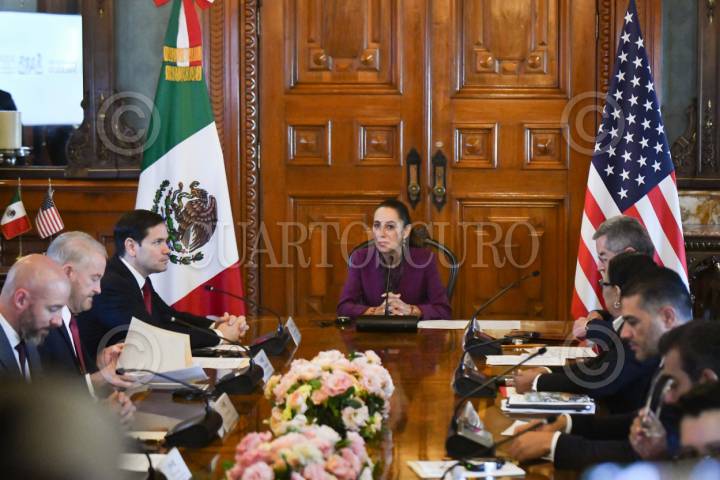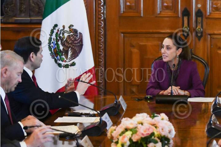CIUDAD DE MÉXICO, 03SEPTIEMBRE2025.- Claudia Sheinbaum, presidenta de México, y Marco Rubio, secretario de Estado de los Estados Unidos, durante la reunión que sostuvieron en Palacio Nacional en la que se abordaron temas de seguridad, migración y comercio. Estuvieron presentes: Ronald Douglas Johnson, embajador de Estados Unidos en México; Juan Ramón de la Fuente, secretario de Relaciones Exteriores, Rosa Icela Rodríguez, secretaria de Gobernación; Omar García Harfuch, secretario de Seguridad y Protección Ciudadana. FOTO: MARIO JASSO/CUARTOSCURO.COM