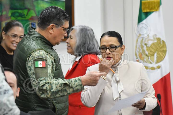 CIUDAD DE MÉXICO, 02AGOSTO2024.- Luis Cresencio Sandoval, secretario de la Defensa Nacional, y Rosa Icela Rodríguez, secretaria de Seguridad y Protección Ciudadana, durante la reunión de seguridad abierto a medios de comunicación, en el salón Ignacio Zaragoza de Palacio Nacional. FOTO: MARIO JASSO/CUARTOSCURO.COM