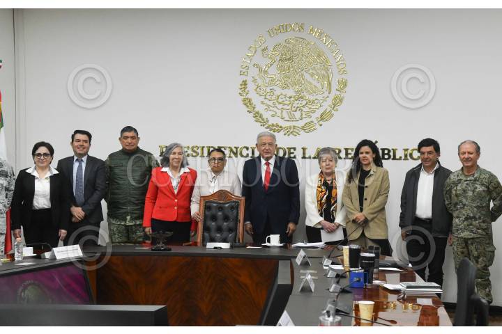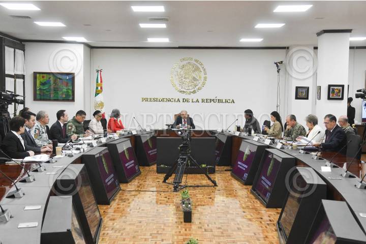 CIUDAD DE MÉXICO, 02AGOSTO2024.- Andrés Manuel López Obrador, presidente de México, encabezó la reunión de seguridad abierto a medios de comunicación, en el salón Ignacio Zaragoza de Palacio Nacional. El mandatario estuvo acompañado por: Laura Velázquez, coordinadora Nacional de Protección Civil; Félix Arturo Medina, subsecretario de Derechos Humanos, Población y Migración; David Córdova Campos, comandante de la Guardia Nacional; Luis Cresencio Sandoval, secretario de la Defensa Nacional; Rosa Icela Rodríguez, secretaria de Seguridad y Protección Ciudadana; María Estela Ríos, consejera Jurídica del Ejecutivo Federal; Jesús Ramírez Cuevas, coordinador de Comunicación Social de Presidencia; Luisa María Alcalde, secretaria de Gobernación; Rafael Ojeda Durán, secretario de Marina; Alicia Bárcena, secretaria de Relaciones Exteriores; Luis Rodríguez Bucio, subsecretario de Seguridad Pública. FOTO: MARIO JASSO/CUARTOSCURO.COM