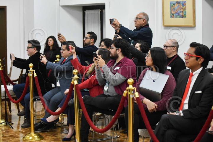 CIUDAD DE MÉXICO, 02AGOSTO2024.- Representantes de medios de comunicación graban la intervención de Andrés Manuel López Obrador, presidente de México, durante la conferencia matutina realizada en el salón Ignacio Zaragoza de Palacio Nacional. FOTO: MARIO JASSO/CUARTOSCURO.COM
