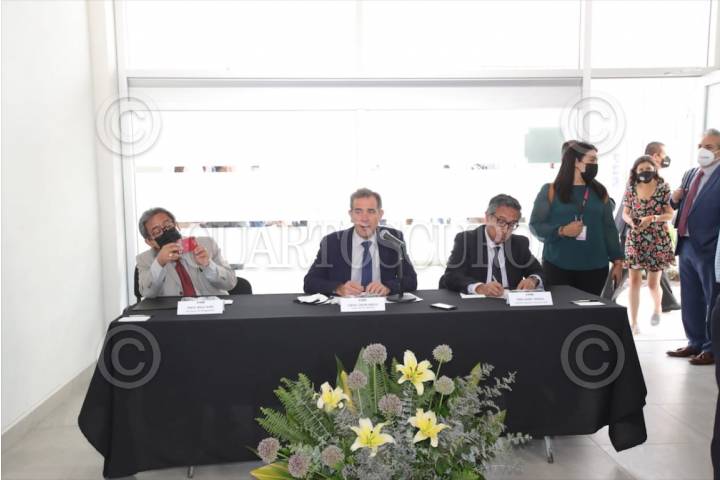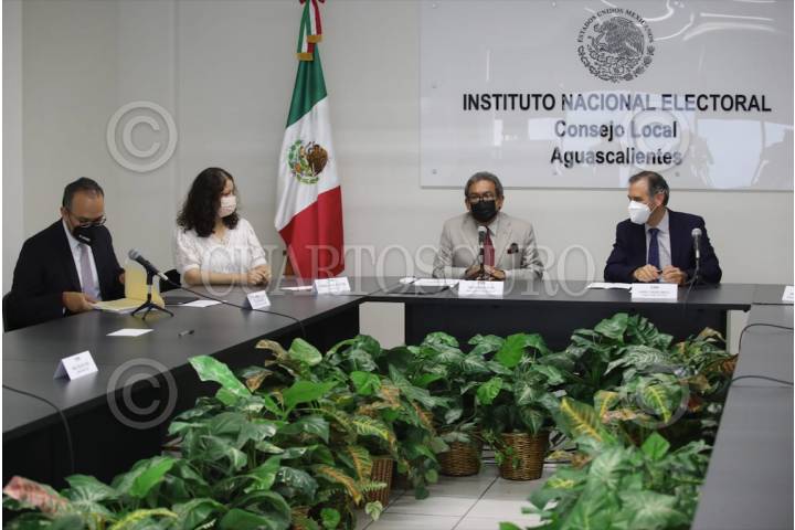 Ignacio Ruelas Olvera, Vocal Ejecutivo del Junta Local de Aguascalientes, Lorenzo Cordova Vianello y Rubén Álvarez Mendiola, Coordinador Nacional de Comunicación Social del INE. tras la reuniónde trabajo en el Consejo Local de Aguascalientes.