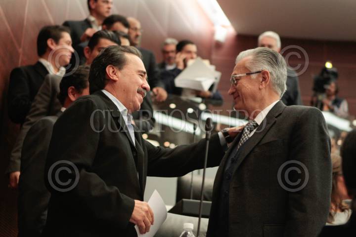MÉXICO, D.F., 08DICIEMBRE2013.- Los senadores Emilio Gamboa Patrón y Manuel Barttlet, durante la reunion extraordinaria de las Comisiones Unidas de Puntos Constitucionales, Energía y Estudios Legislativos en materia energética en el Senado de la República. FOTO: SENADO / CUARTOSCURO.COM