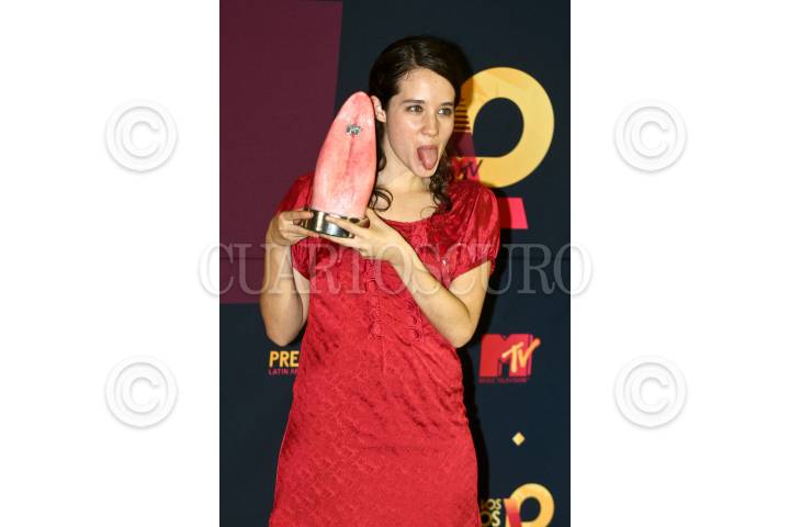 GUADALAJARA, JALISCO 16OCTUBRE2008.- La cantante Ximena Sariñana muestra su presea al haber ganado en la categoria revelacion femenina durante la entrega de premios MTV Latinoamerica FOTO: SÁSHENKA GUTIÉRREZ/CUARTOSCURO.COM