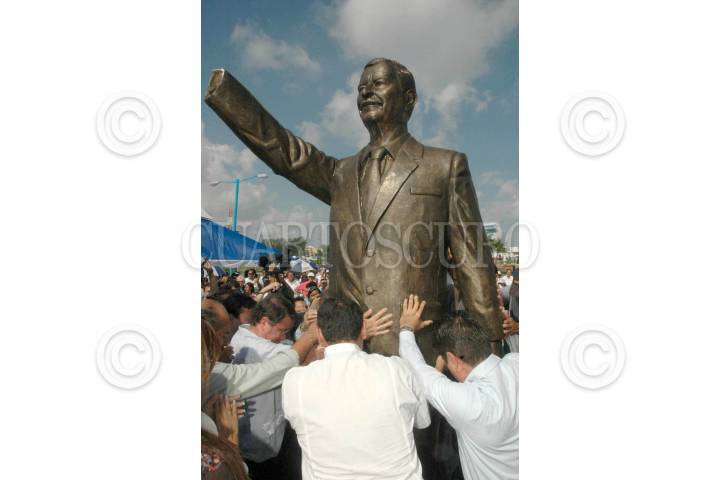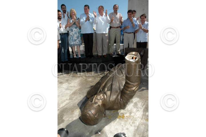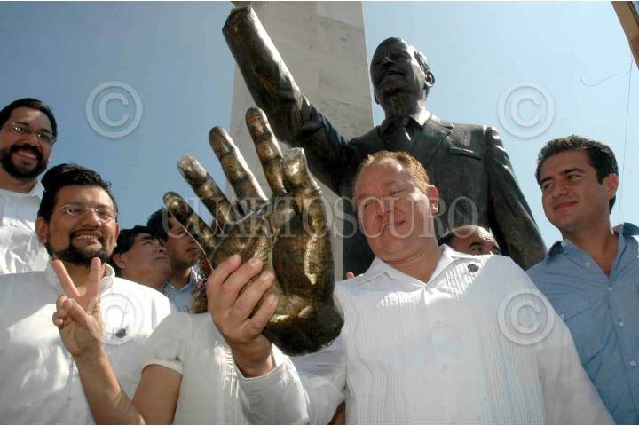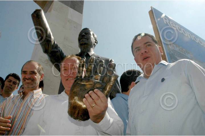 BOCA DEL RÍO, VER; 14OCTUBRE2007.- Este medio dÌa se realizó, como estaba programada, la "revelación" de la estatua del expresidente Vicente Fox. Donde el alcalde de Boca del RÌo, Francisco Gutierrez de Velasco Urtaza, en compañia de alcaldes, diputados y miembros de la dirigencia estatal del PAN junto a su dirigente VÌctor Alejandro Vazquez Cuevas "levantaron" la efigie que el día de ayer fuera derribada por militantes Priistas. FOTO: JOSÉ CANDELARIO/CUARTOSCURO.COM