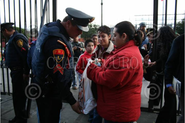 MÉXICO D.F., 15SEPTIEMBRE2010.- Policías Capitalinos revisan a los asistentes en los alrededores del escenario que se ubica en El Caballito en donde se presentaron bandas de rock por motivo de los festejos del Bicentenario de la Independencia. FOTO: RODOLFO ANGULO/CUARTOSCURO.COM