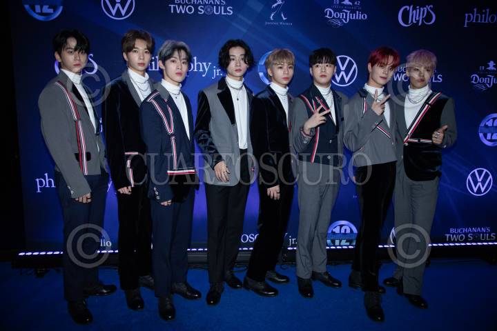 El grupo de KPop TFN a su paso por la alfombra azul por el 12vo aniversario aniversario de la revista Estilo DF en un hotel al poniente de la ciudad.