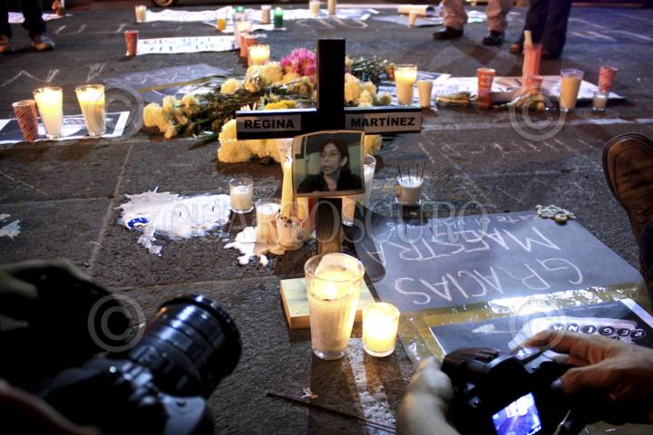 XALAPA, VERACRUZ, 30ABRIL2012.- Comunicadores de diversos puntos de la República mexicana se congregaron durante la madrugada para dar el último adiós a la periodista Regina Martínez Pérez, corresponsal de la Revista Proceso, luego de que fue asesinada en su casa el pasado 28 de Abril del 2012 en esta ciudad. FOTO: FELIX MÁRQUEZ /CUARTOSCURO.COM