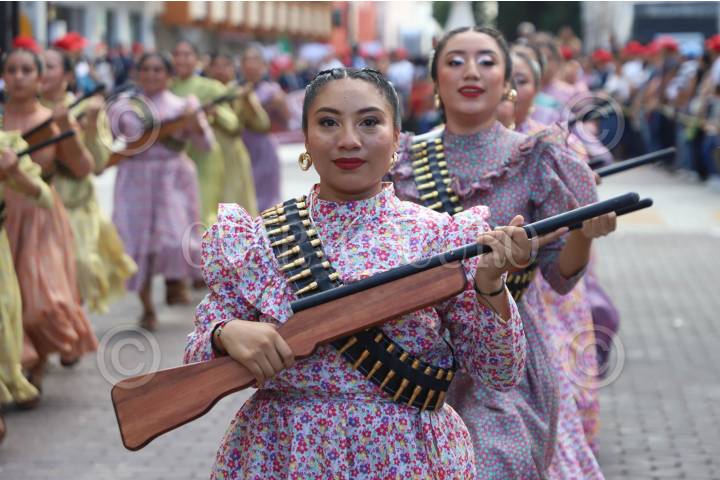 CIUDAD DE MÉXICO, 16SEPTIEMBRE2025.- Mujeres que representan la Revolución mexicana durante el Desfile cívico militar conmemorativo del 215 Aniversario de la Independencia en México en el recorrido en el Centro Histórico. FOTO: GRACIELA LÓPEZ/CUARTOSCURO.COM
