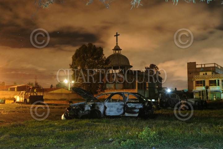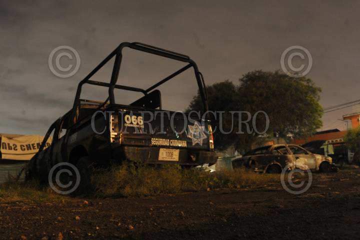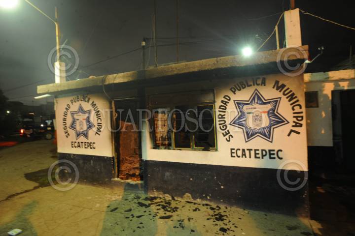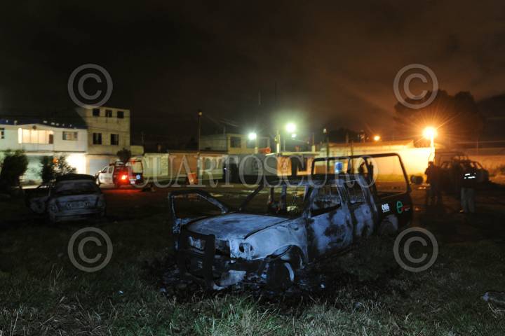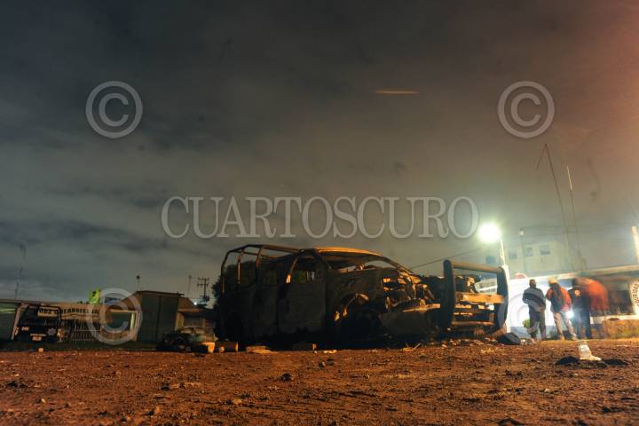 ECATEPEC, ESTADO DE MÉXICO., 22OCTUBRE2014.- Cinco vehículos quemados, entre estos tres patrullas municipales, una de seguridad privada, un taxi y un módulo de policía, fueron calcinados, así como una tienda coopel saqueada por vecinos de la colonia Luis Donaldo Colosio, luego de que en este lugar trataran de secuestrar a una jovencita tres personas a bordo de un auto Ibiza, de donde uno de los ocupantes se identificara como policía municipal. Los disturbios y bloqueos, fueron realizados como protesta por la falta de seguridad de la zona. FOTO: LUIS CARBAYO /CUARTOSCURO.COM