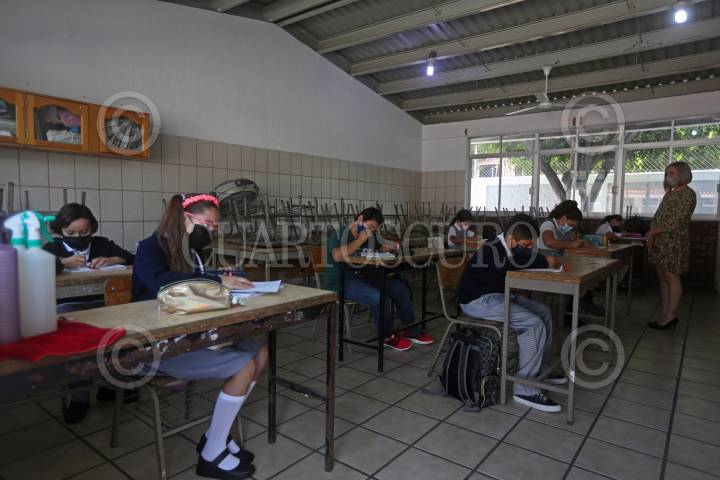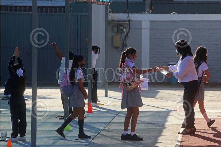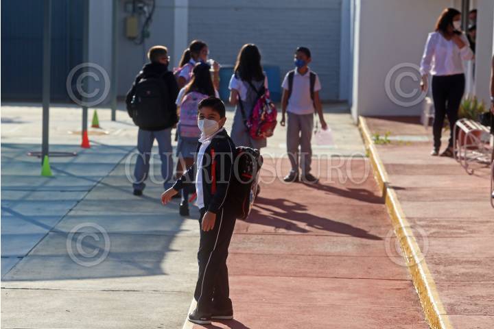 Niños tapatíos regresan a las aulas de la Primaria Adalberto Navarro Sánchez, esta mañana tras las problemáticas de rezago que dejaron la Pandemia Sanitaria por Covid-19.