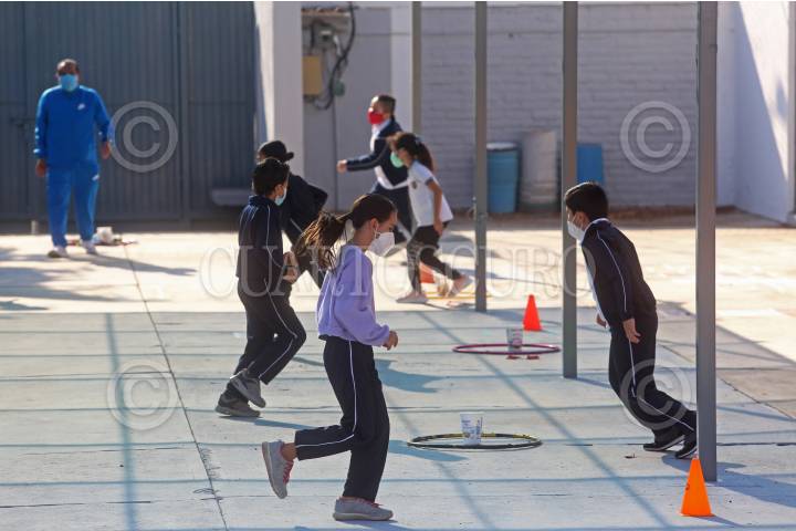 Niños de la Primaria Adalberto Navarro Sánchez, toman la clase de educación Física, hoy después del regreso a las aulas y tras las problemáticas de rezago que dejaron la Pandemia Sanitaria por Covid-19.