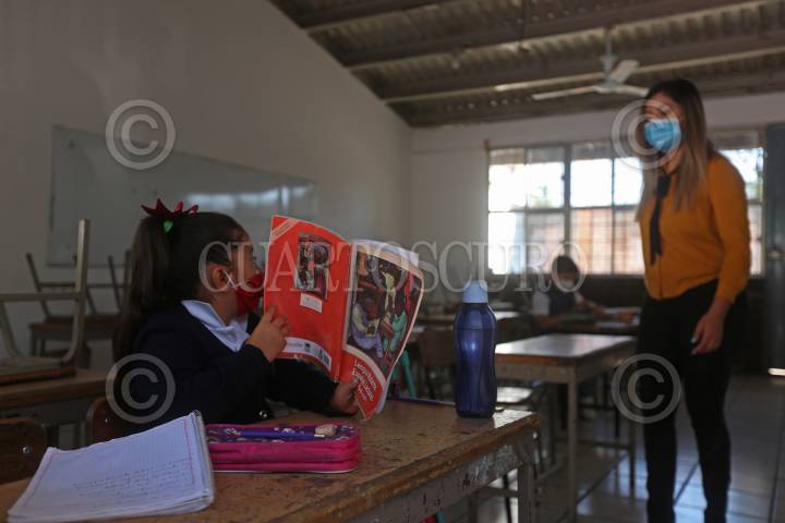 Una niña realiza una pregunta a su docente hoy después de regresar a las aulas de clases, los niños de la Primaria Adalberto Navarro Sánchez y tras las problemáticas de rezago que dejaron la Pandemia Sanitaria por Covid-19.