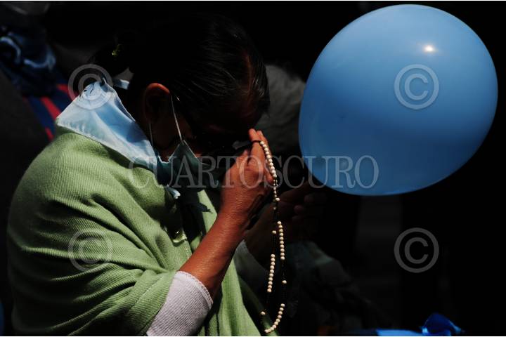 Una mujer alza su rosario mientras reza frente a la SCJN.
