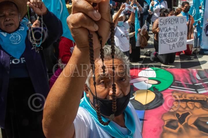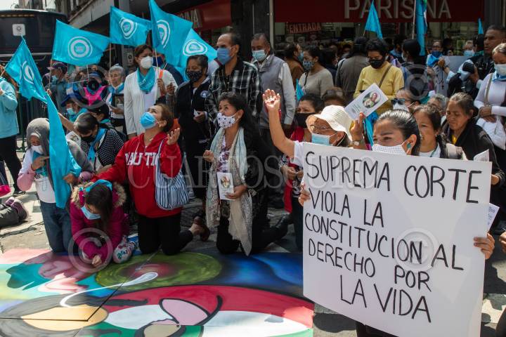 Durante la discusión de la despenalización del aborto en la SCJN, manifestantes provida rezan frente a sus instalaciones pidiendo no se apruebe.