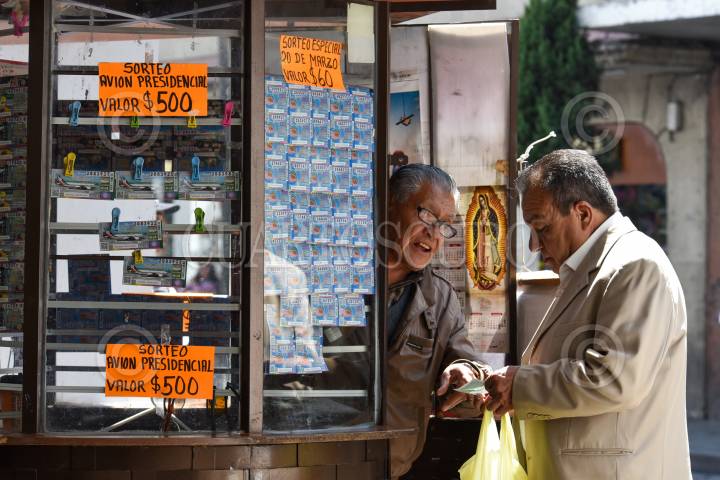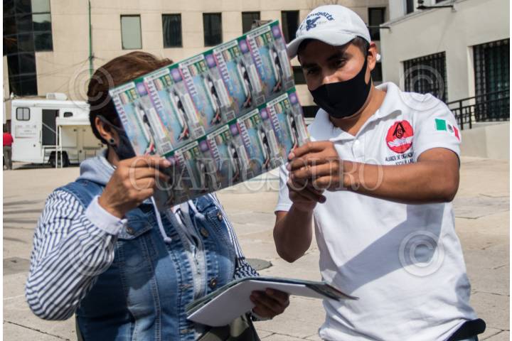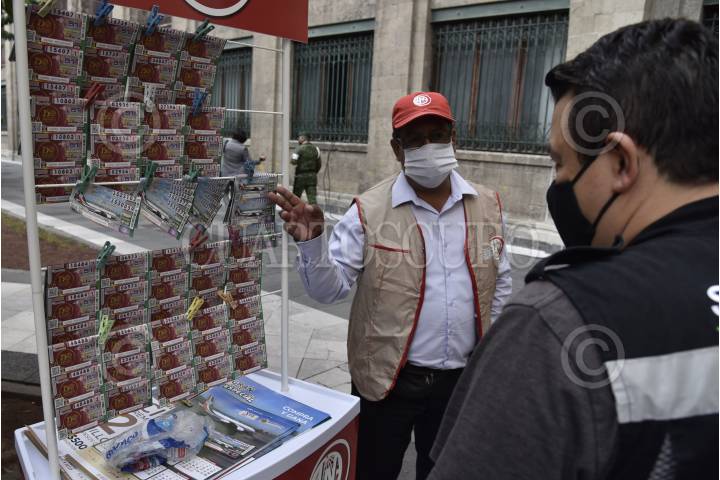 Venta de cachito de lotería para la rifa del Avión Presidencial en la capital mexiquense.