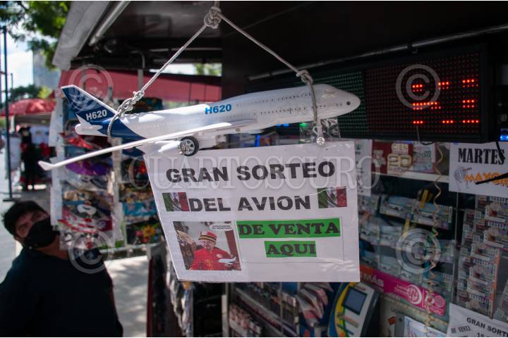 Un avión de juguete cuelga de un expendio de boletos de lotería en referencia al Gran Sorteo del Avión Presidencial a celebrarse el próximo 15 de septiembre.