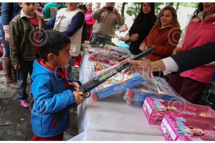 MÉXICO, D.F., 28SEPTIEMBRE2015.- Durante la jornada de Desarme Voluntario, convocada por la Secretaría de Seguridad Pública, niños y vecinos de la delegación Azcapotzalco intercambiaron juquetes bélicos, y armas de fuego, por juguetes inofensivos, en el caso de los pequeños, y dinero en efectivo a cambio de pistolas de grueso calibre y escopetas. FOTO: MARÍA JOSÉ MARTÍNEZ /CUARTOSCURO.COM