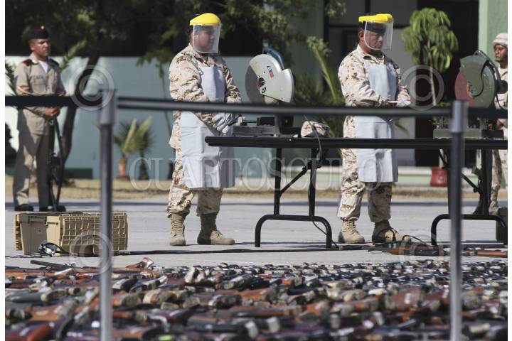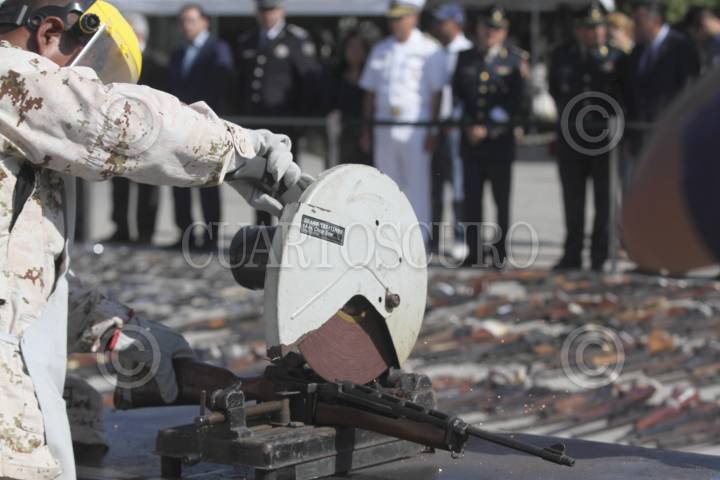 TIJUANA, BAJA CALIFORNIA, 12AGOSTO2016.- Se realizó la Ceremonia de Destrucción de Armas de Fuego en la Segunda Zona Militar, encabezada por el General de la Segunda Zona y autoridades de los tres niveles de gobierno. La destrucción de más de 2 mil 136 pistolas y rifles fue realizada con una cortadora, para después enterrarlas; esto con la intención de evitar que la ciudadanía ponga en peligro su integridad física. La mayoría de armas fueron utilizadas por la delincuencia organizada. En lo que va del año, el Ejercito Mexicano ha destruido más de cuatro mil. FOTO: CHRISTIAN SERNA /CUARTOSCURO.COM