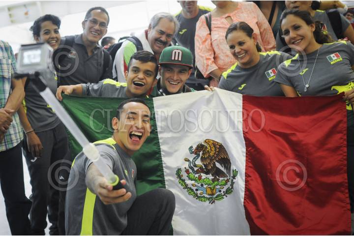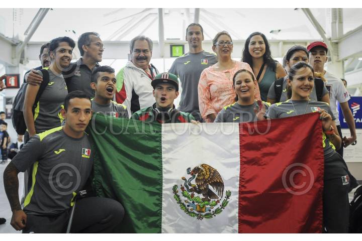 CIUDAD DE MÉXICO, 27AGOSTO2016.- Los nadadores Luis Armando Andrade Guillén, Raúl Alberto Martínez Valdez, Gustavo Sánchez, Nely Miranda y Vianney Trejo, quienes son parte de la delegación mexicana que participará en los Juegos Paralímpicos Río 2016, llegaron a la terminal 1 del Aeropuerto capitalino, para partir con rumbo a Brasil y buscar ganar en sus respectivas categorías alguna medalla. FOTO: DIEGO SIMÓN SÁNCHEZ /CUARTOSCURO.COM