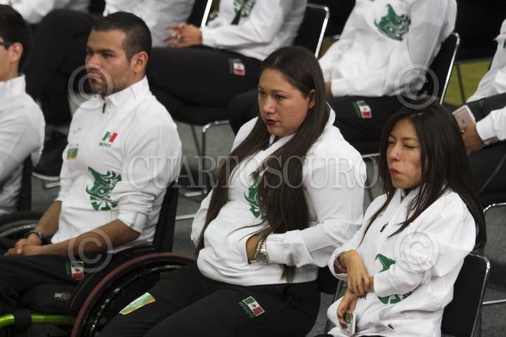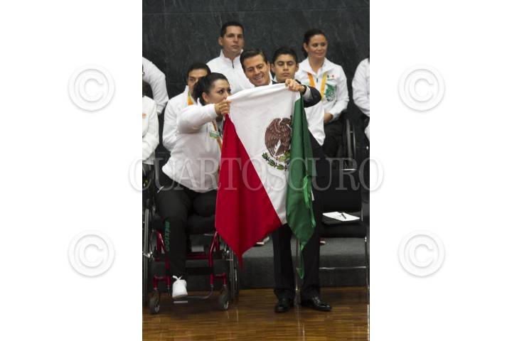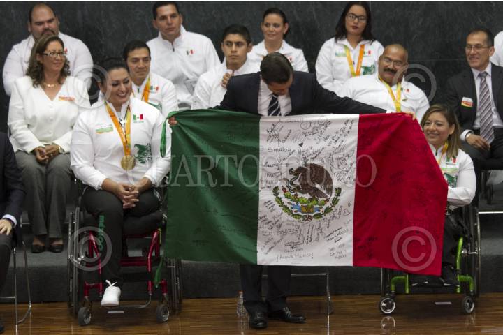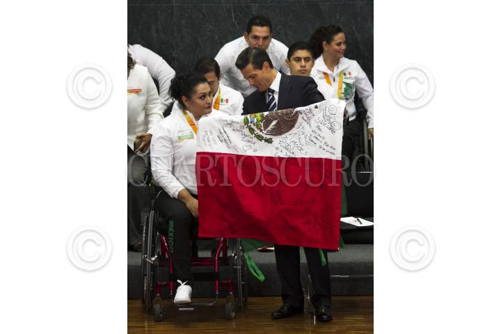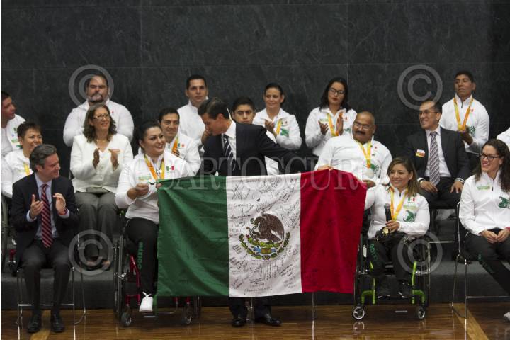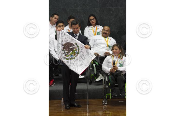 CIUDAD DE MÉXICO, 27SEPTIEMBRE2016.- El Presidente de la República Enrique Peña Nieto se reunió con la delegación que participó en los juegos paralímpicos "Río 2016", esta delegación ganó 15 medallas en esta edición y le exigieron se impulse y apoye más al deporte adaptado. Al finalizar la ceremonia los atletas le regalaron una bandera con las firmas de todos los deportistas que integraron la comitiva mexicana. FOTO: MOISÉS PABLO /CUARTOSCURO.COM