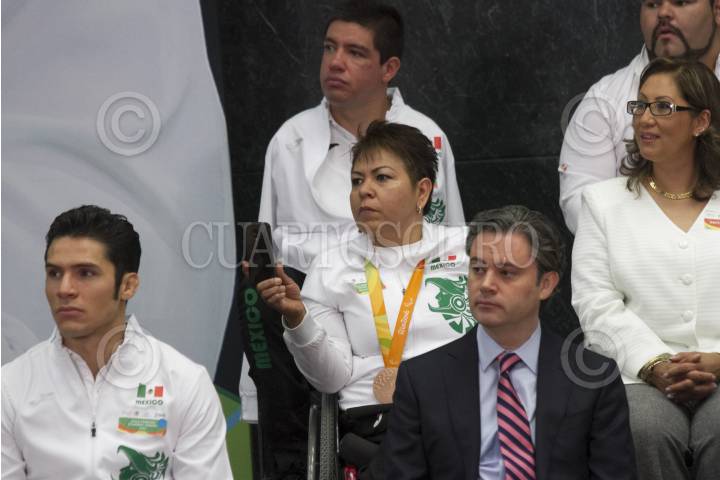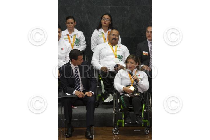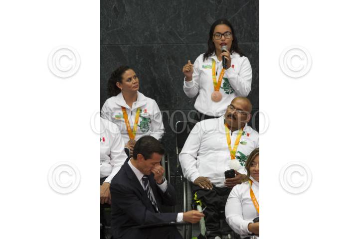 CIUDAD DE MÉXICO, 27SEPTIEMBRE2016.- La medallista de oro en levantamiento de potencia, Amalia Pérez, durante la reunión que sostuvó la delegación mexicana que participó en los juesgo paralímpicos "Río 2016" con el Jefe del Ejecutivo, Enrique Peña Nieto, en la residencia oficial de Los Pinos. FOTO: MOISÉS PABLO /CUARTOSCURO.COM