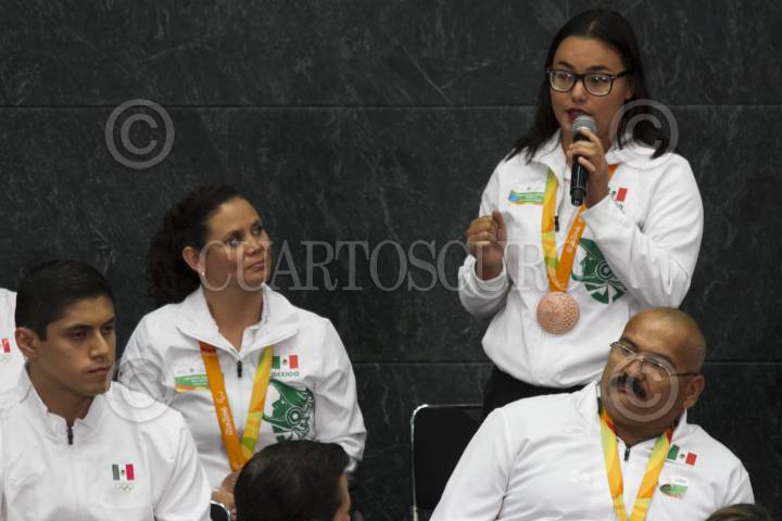 CIUDAD DE MÉXICO, 27SEPTIEMBRE2016.- La medallista de bronce en lanzamiento de bala, Rebeca Valenzuela, durante su participación en la reunión que sostuvó la delegación mexicana de "Río 2016" con el Jefe del Ejecutivo, Enrique Peña Nieto, en la residencia oficial de Los Pinos. FOTO: MOISÉS PABLO /CUARTOSCURO.COM