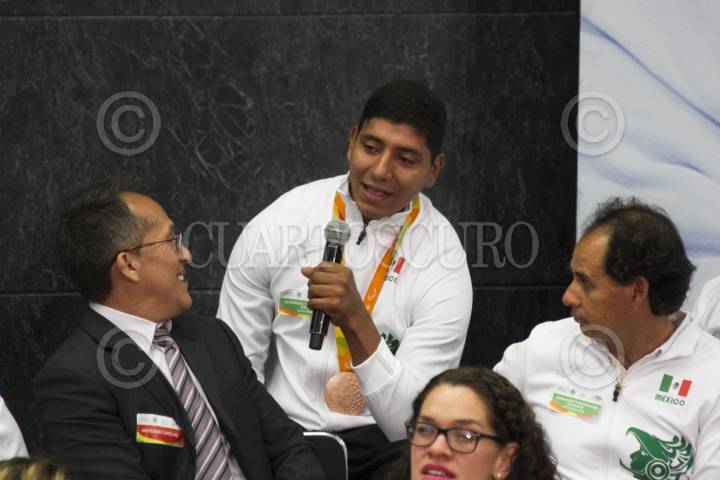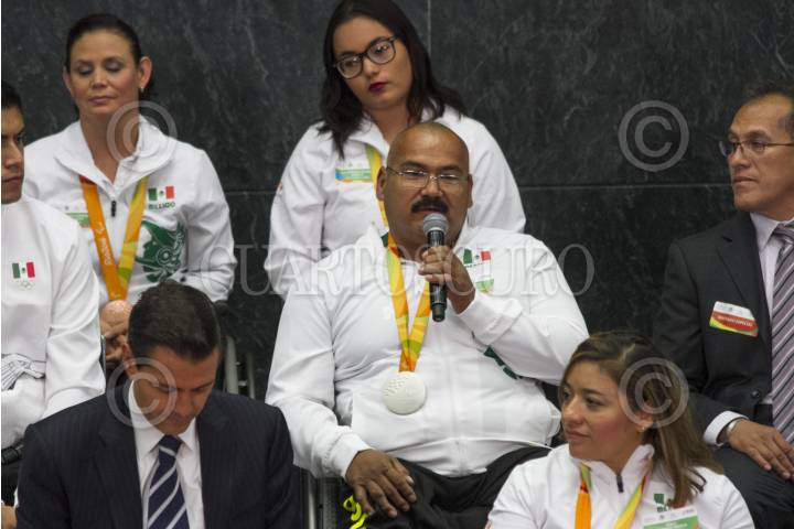 CIUDAD DE MÉXICO, 27SEPTIEMBRE2016.- El medallista de plata en lanzamiento de jabalina, Luis Alberto Zepeda Félix, durante su participación en la reunión que sostuvó la delegación mexicana de "Río 2016" con el Jefe del Ejecutivo, Enrique Peña Nieto, en la residencia oficial de Los Pinos. FOTO: MOISÉS PABLO /CUARTOSCURO.COM