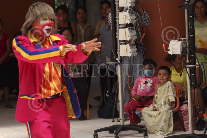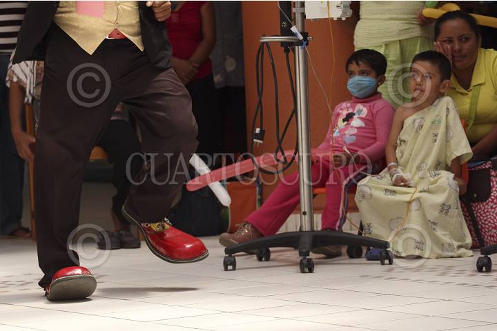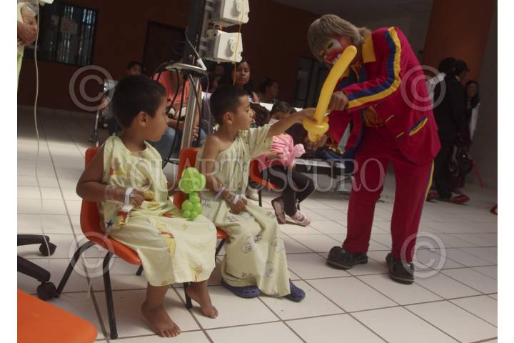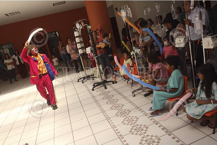 SAN BARTOLO COYOTEPEC, OAXACA, 28ABRIL2014.- Un grupo de payasos que integran la organización de "Amigos en recuperación" y que llevan a los hospitales la "risoterapia" se presentaron en el Hospital de la Niñez Oaxaqueña Dr. Guillermo Zárate Mijangos donde divirtieron a los pequeños que se encuentran internados en el nosocomio, esto como parte de las festividades del día del niño. FOTO: ARTURO PÉREZ ALFONSO /CUARTOSCURO.COM