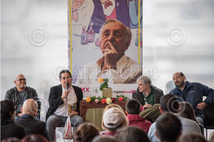 CIUDAD DE MÉXICO, 10AGOSTO2017.- Los caricaturistas, Rafael Pineda “Rape”, Rafael Barajas Durán “El Fisgón”, Arturo Kemchs, y Ariel Rosales, editor de “Rius”, durante el homenaje póstumo del caricaturista Eduardo del Río “Rius” (1934-2017), fallecido el pasado martes a los 83 años de edad. FOTO: MARIO JASSO /CUARTOSCURO.COM