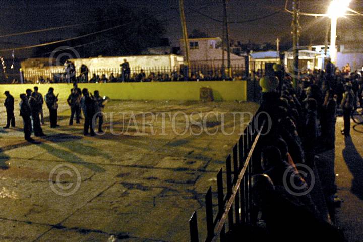 TEXCOCO. EDOMEX.- 20ABRIL2007.- Habitantes de la comunidad San Andres Riva Palacio se enfrentaron a golpes en varias ocaciones a las afueras de la delegacion municipal de la entidad, debido a las diferencias de resultados del candidato que obtuvo el triunfo para la dirigencia de las elecciones del Consejo de Participación Ciudadana, al rededor de las dos de la mañana 50 personas se atrincheraban en la delegación, entre ellos el secretario del ayuntamiento de Texcoco Manuel Carrillo Jara. En el lugar se encontraba el grupo antimontin de la Agencia de Seguridad Estatal para resguardar el lugar ante posibles enfrentamientos. FOTO: SAÚL LÓPEZ/CUARTOSCURO.COM