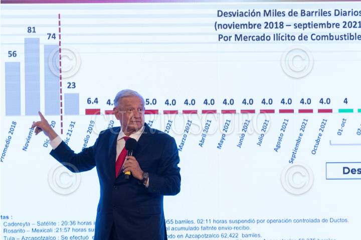 Andrés Manuel López Obrador, Presidente de México, presentó una lámina con información sobre el robo de combustible a Pemex.