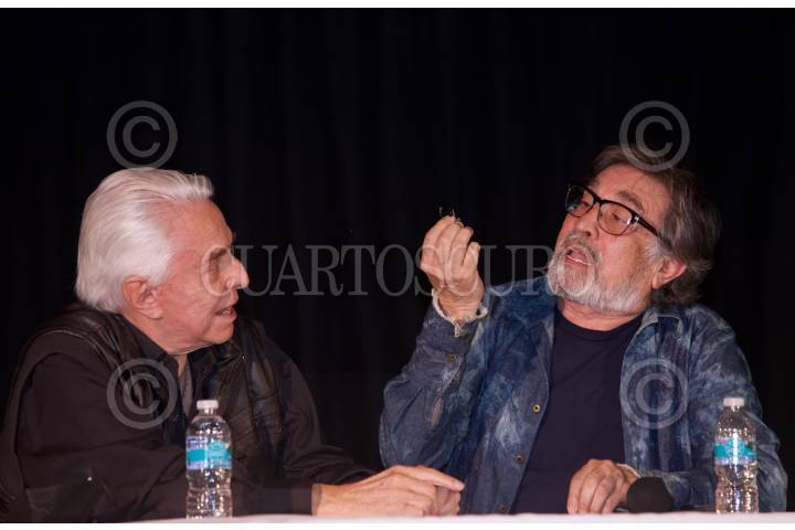 Enrique Guzmán y Benny Ibarra durante la conferencia de prensa con integrantes de las agrupaciones Los Locos de Ritmo, Los Hermanos Carrión, Los Rebeldes del Rock, Lo Hooligans y Los Rockin Devils que participarán en el concepto Chavos + Ruckos, evento realizado en el Teatro Ofelia.
