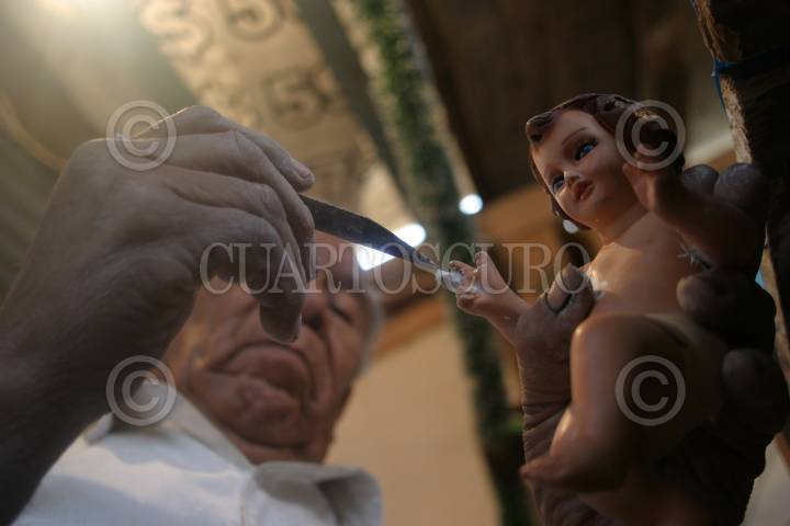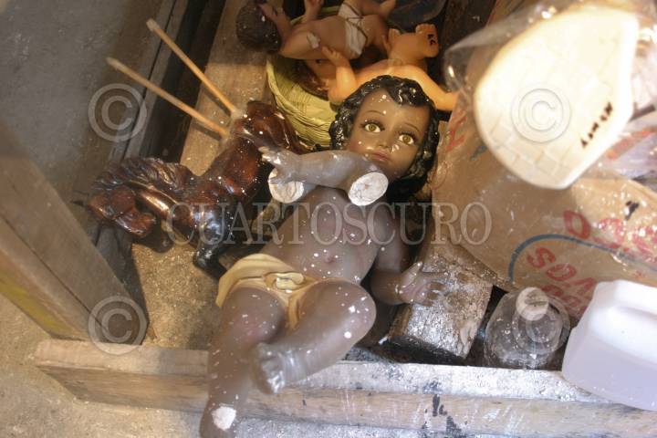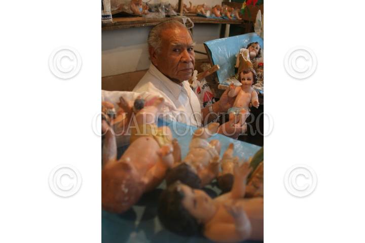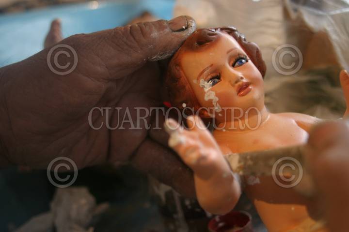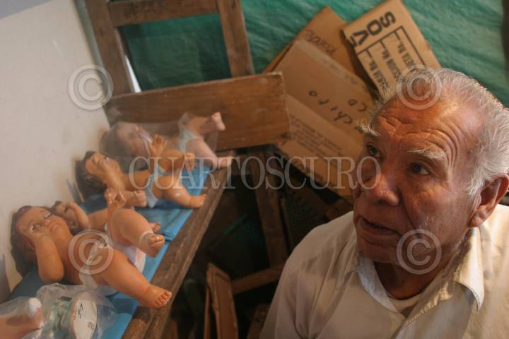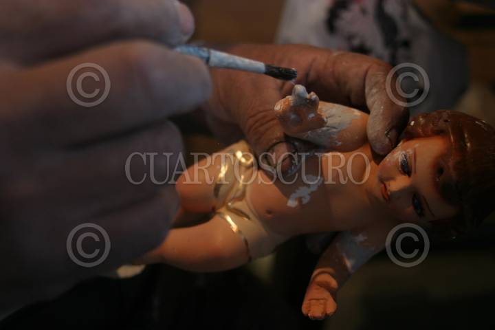 MÉXICO D.F., 22DICIEMBRE2008.- Morenos, claros, grandes y pequeños, de diversos tamaños son los niños dioses que para estas fechas esperan ser reparados por este hombre que también se hace llamar un cirujano de dios, ya que se encuentra rodeado de manos, dedos, y cuerpesitos en mal estado, donde este hombre con mas de 20 años de experiencia hace la reparacion de los niños dioses pues ya están en puerta las tradicional“arrullo”, donde la figura de Cristo en niño es el centro. FOTO: SÁSHENKA GUTIÉRREZ/CUARTOSCURO.COM
