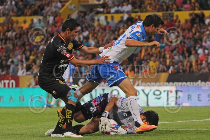 GUADALAJARA, JALISCO. 11ABRIL2015.- El jugador de Leones José Díaz, disputa un balón frente a los contrarios del Puebla Sergio Pérez y Rodolfo Cota, en partido correspondiente a la Jornada 13 del Torneo Clausura 2015 de la Liga MX, en donde se enfrentan los equipos de los Leones Negros de la Universidad de Guadalajara frente a los Camoteros de Puebla, en juego celebrado en el Estadio Jalisco. FOTO: FERNANDO CARRANZA GARCIA / CUARTOSCURO.COM