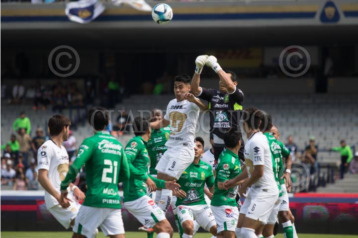 CIUDAD DE MÉXICO, 24FEBRERO2019.- El delantero Felipe Mora (Pumas) disputa un balón en lo alto con el portero Rodolfo Cota (León) en partido correspondiente a la jornada 8 de la Liga Mex, disputado en el Estadio Olímpico en Ciudad Universitaria. Los "panzas verdes" lograron un contundente 3-1. FOTO: MOISÉS PABLO /CUARTOSCURO.COM