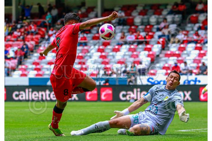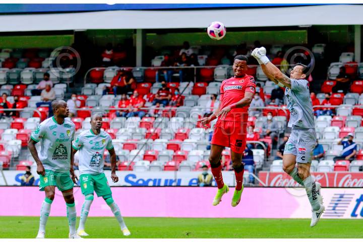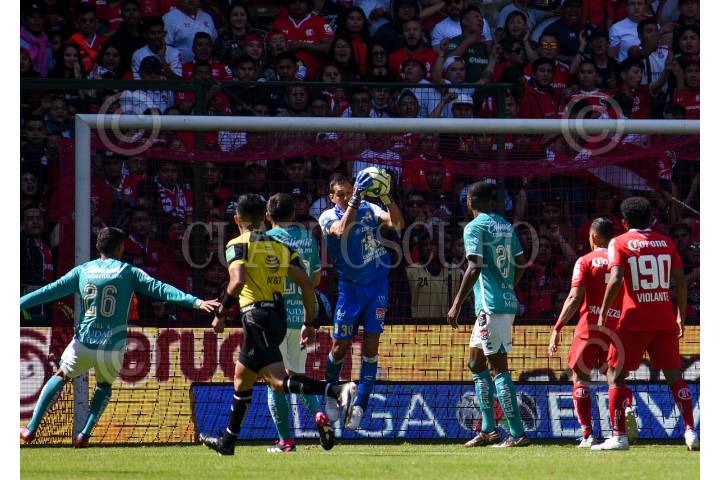 Kevin Castañeda medio de los Diablos Rojos del Toluca pelea el esférico a Rodolfo Cira portero de la escuadra escarlata de León en el partido de la jornada 16, terminando el encuentro 0-0.